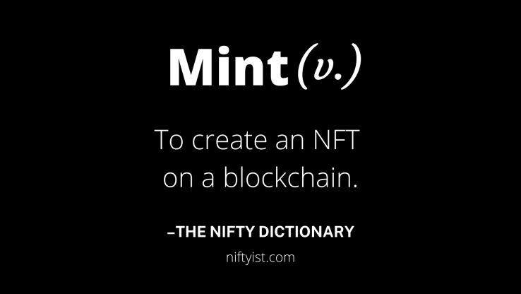 Minting means creating a new NFT. Recall that NFT stands for non-fungible token. Just as a metal coin must be minted in the real world, a non-fungible token must be minted digitally. The token is minted on a blockchain such as Ethereum, a public database where it can be stored, traced, and traded. To mint a token is to create a new entry in that database.